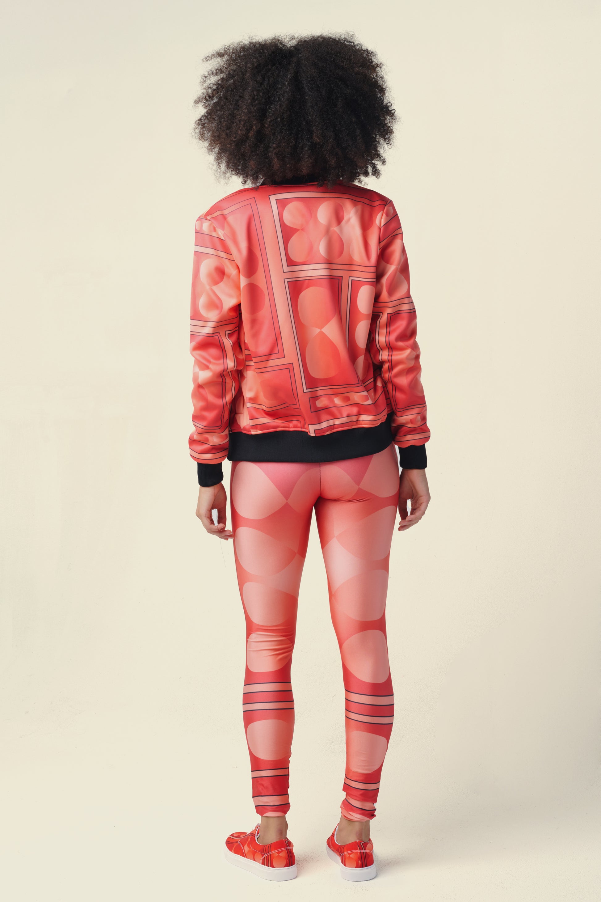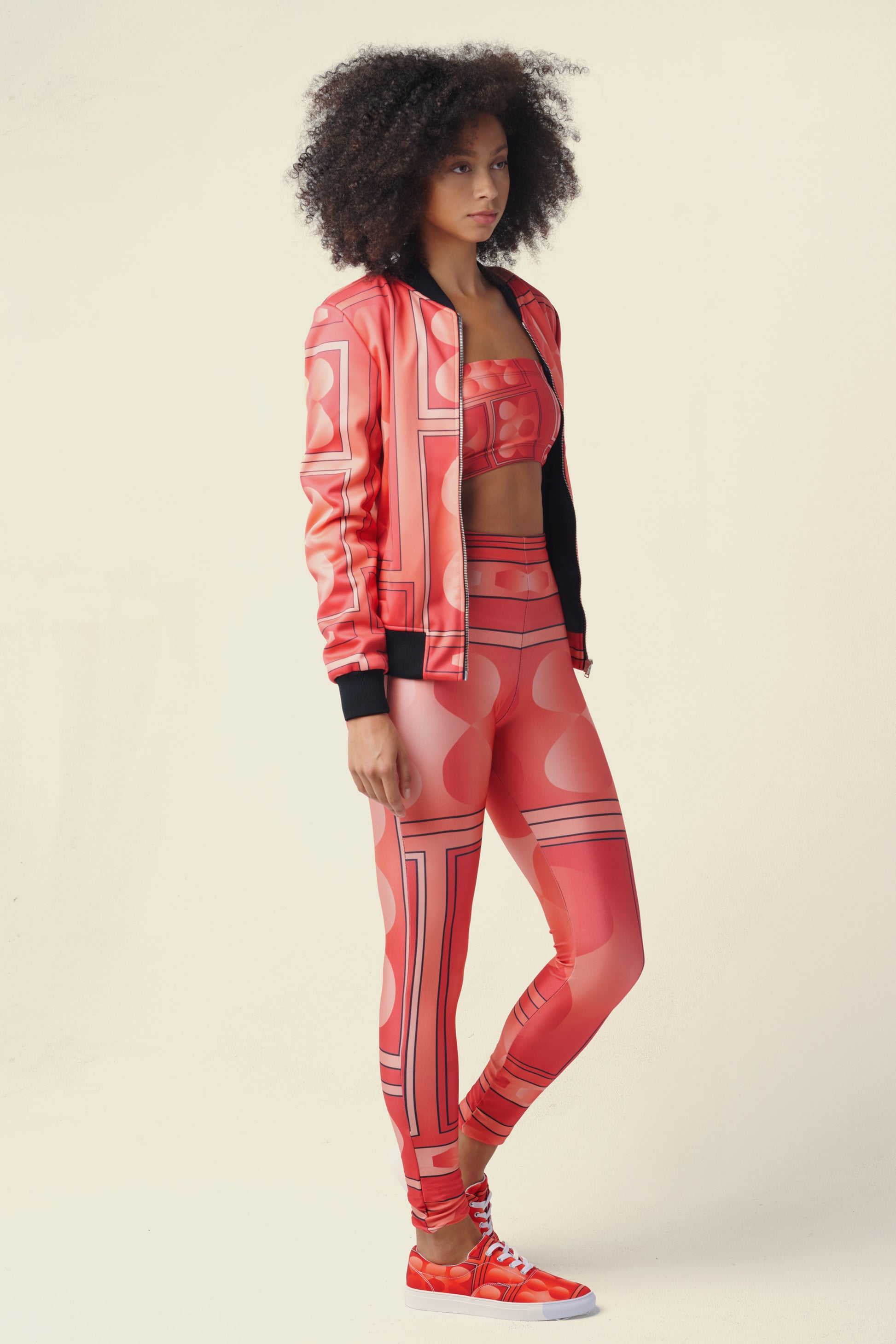 Athleisure Wear at its finest, featuring artist Sharon A. Keyser’s original Infinity design in Red. The Collection debuted on the runway for New York Fashion Week and sports a modern Bomber Jacket, Bandeau Top, Leggings and matching Canvas Lace-Up Sneakers. The garments are comfortable, casual and easy to wear, with an upscale visual appeal that makes them perfect for even non-athletic social settings.