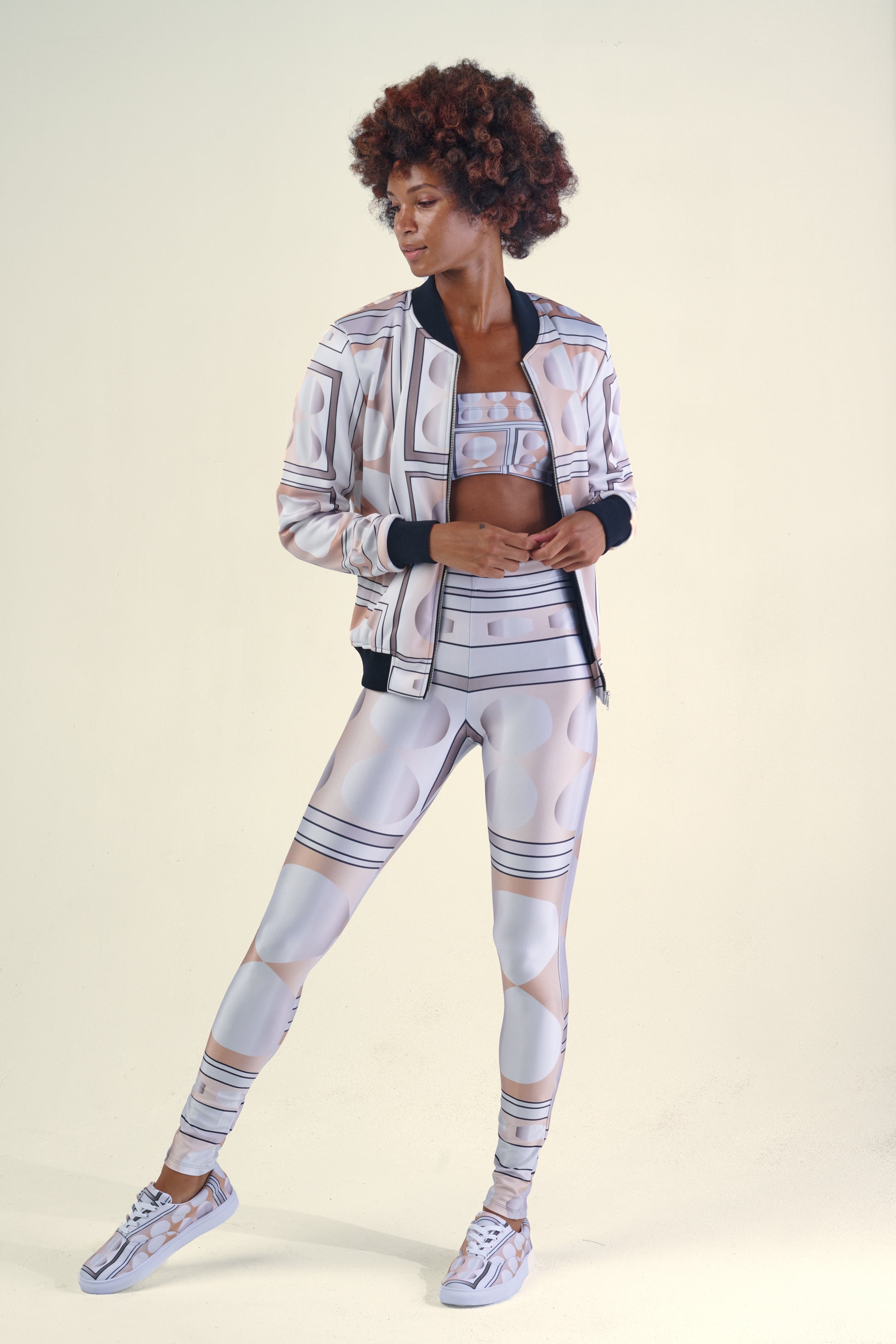 Athleisure Wear at its finest, featuring artist Sharon A. Keyser’s original Infinity design in Champagne. The Collection debuted on the runway for New York Fashion Week and sports a modern Bomber Jacket, Bandeau Top, Leggings and matching Canvas Lace-Up Sneakers. The garments are comfortable, casual and easy to wear, with an upscale visual appeal that makes them perfect for even non-athletic social settings.